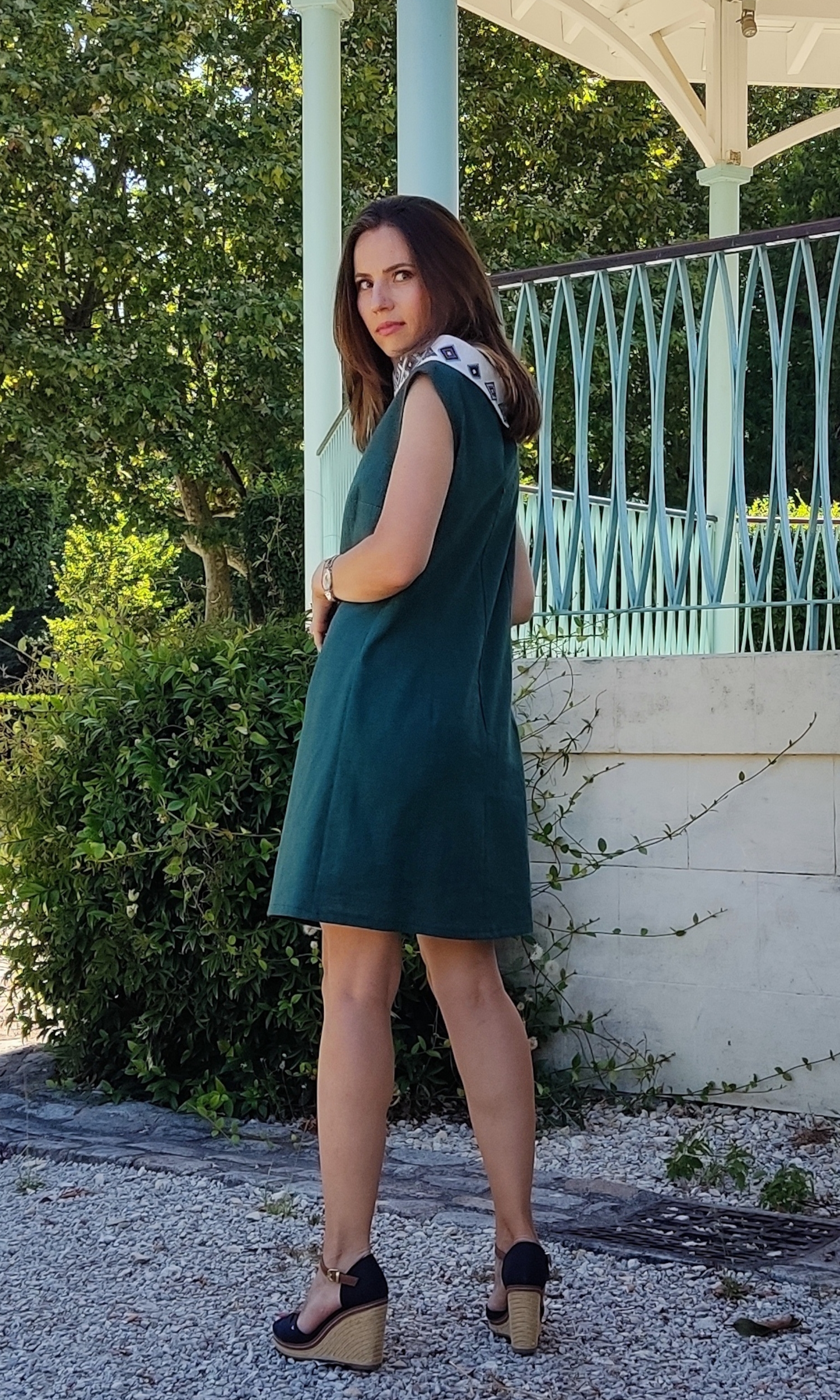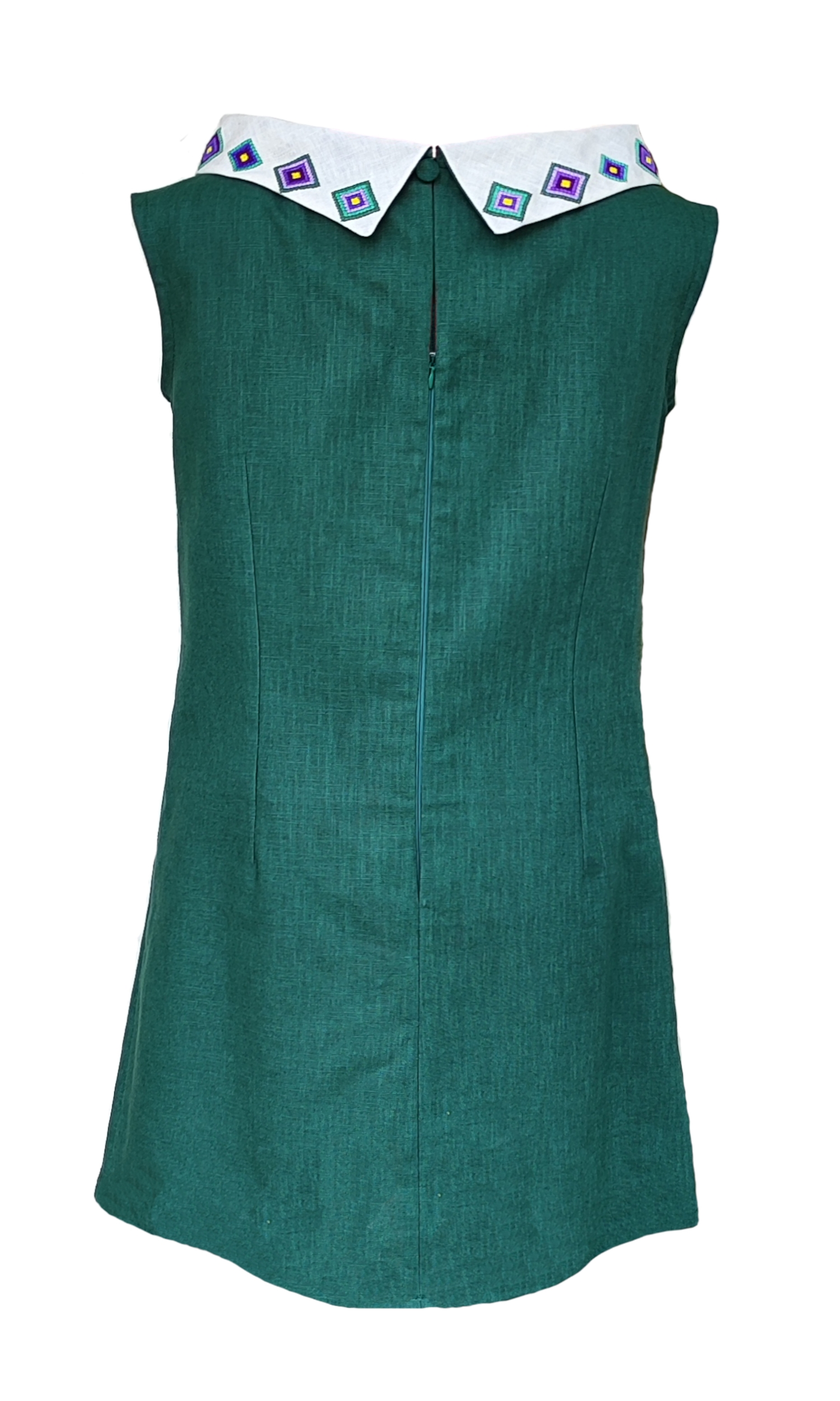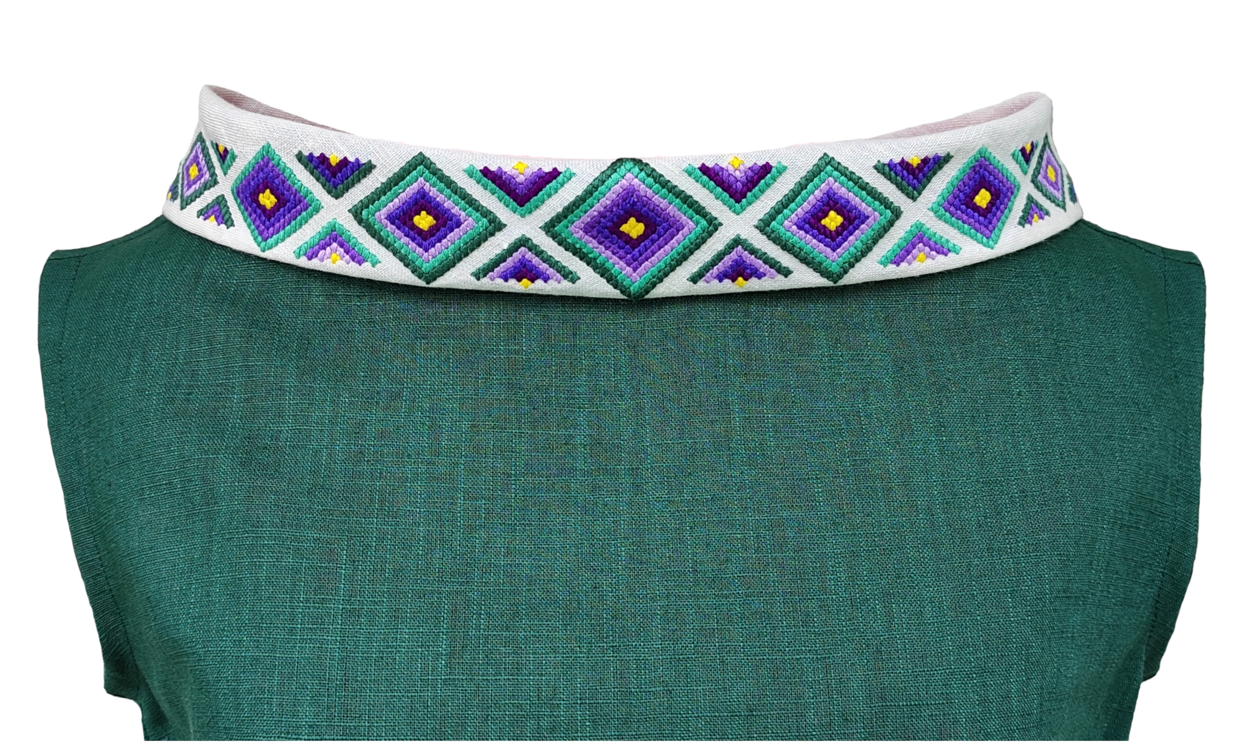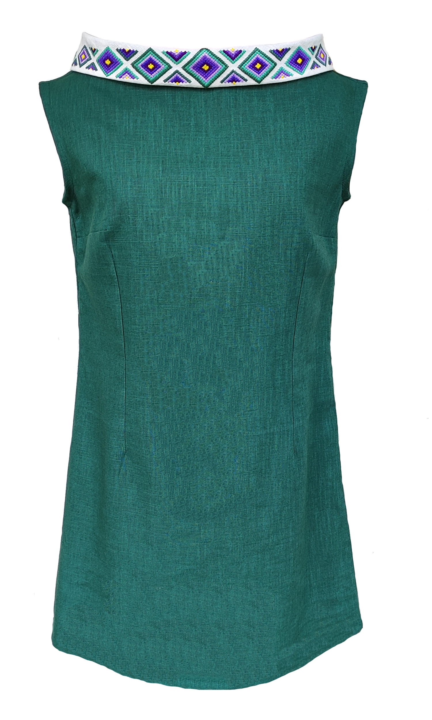 Robe verte en lin, sans manches, dotée d’un élégant col bénitier brodé en forme de diamants colorés pour une touche d’éclat. La coupe sans manches et le tissu en lin offrent un confort parfait. Une pièce lumineuse et sophistiquée, idéale pour les occasions spéciales.