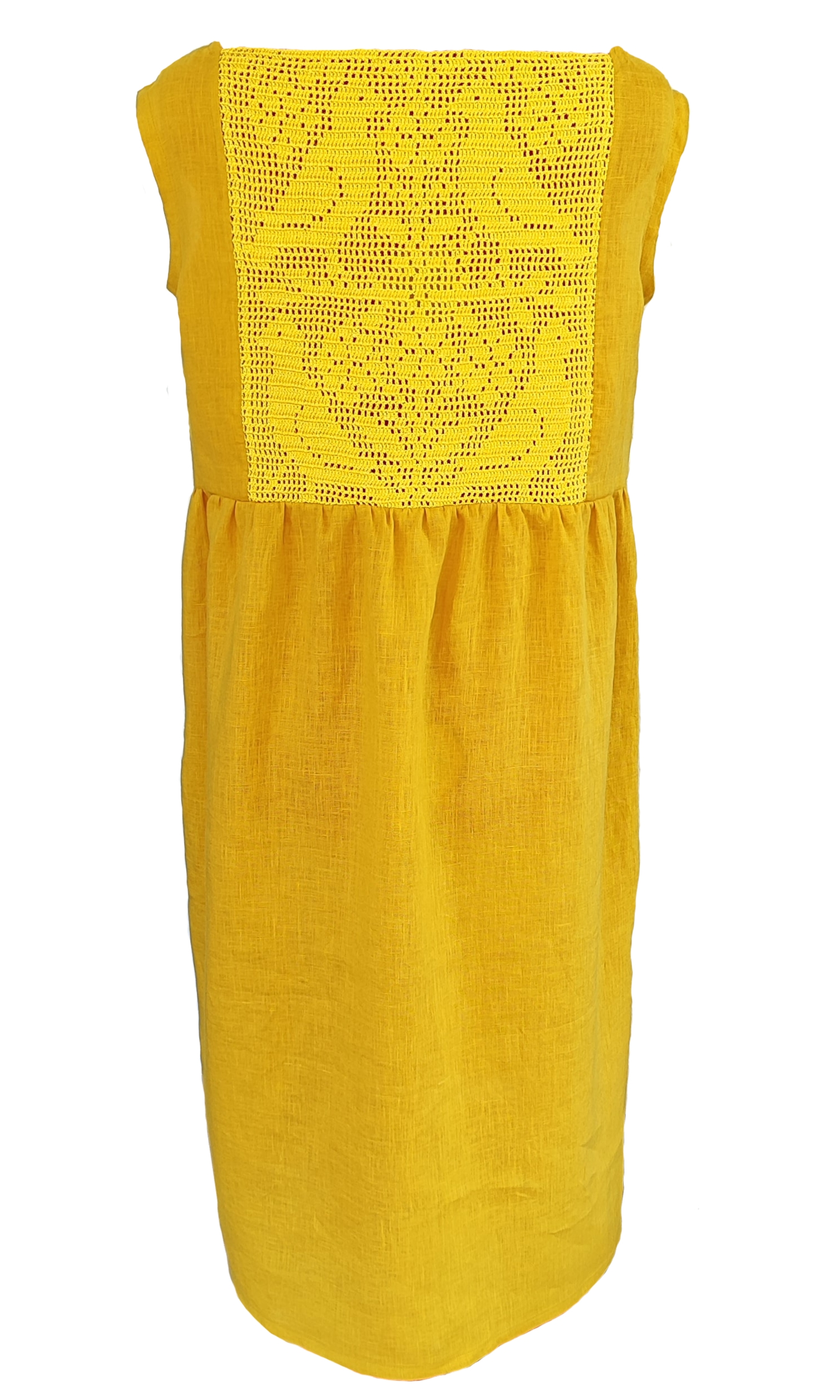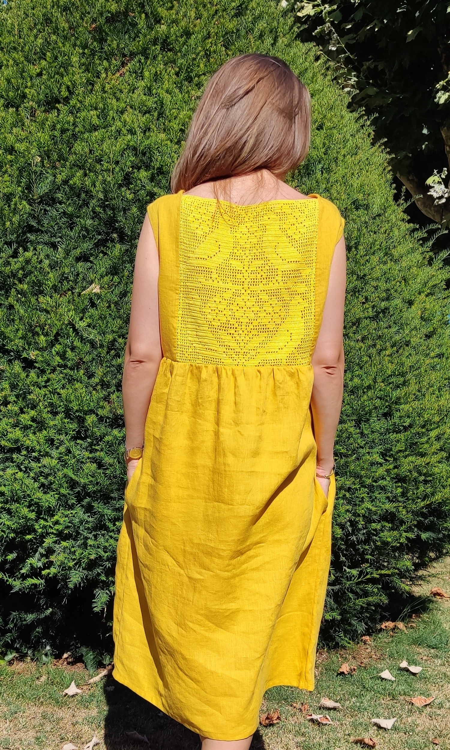 Cette robe lumineuse, en lin léger, allie confort et élégance grâce à son dos délicatement crocheté. Sa couleur jaune vif évoque la chaleur des journées ensoleillées, tandis que le crochet ajoute une touche bohème raffinée. Parfaite pour un déjeuner en terrasse ou une soirée estivale, elle se marie facilement avec des accessoires naturels, comme des sandales en cuir ou un panier en osier. Un must-have pour toute garde-robe d’été !